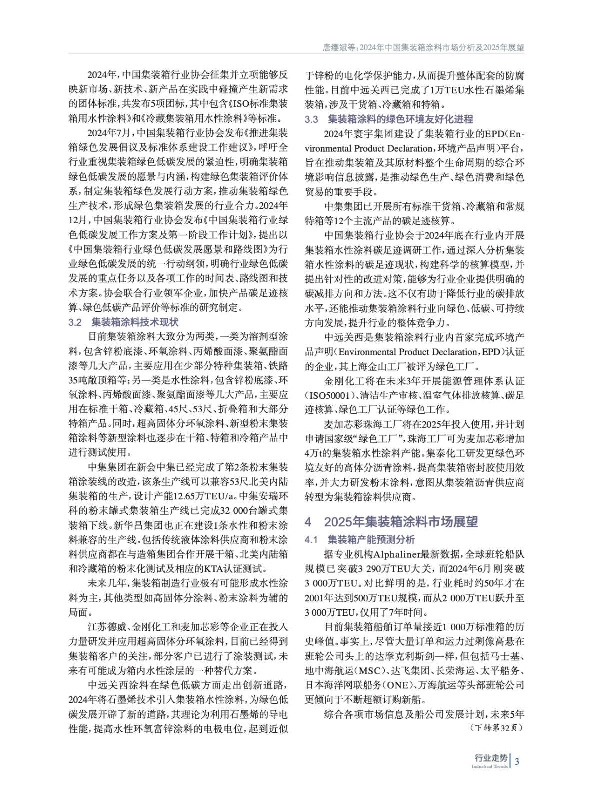 綜述了2024年我國集裝箱制造業市場和集裝箱涂料市場總體情況,并從政策環境、技術現狀、綠色環境友好化進程對集裝箱涂料技術進行分析,預測了2025年集裝箱涂料市場發展趨勢。