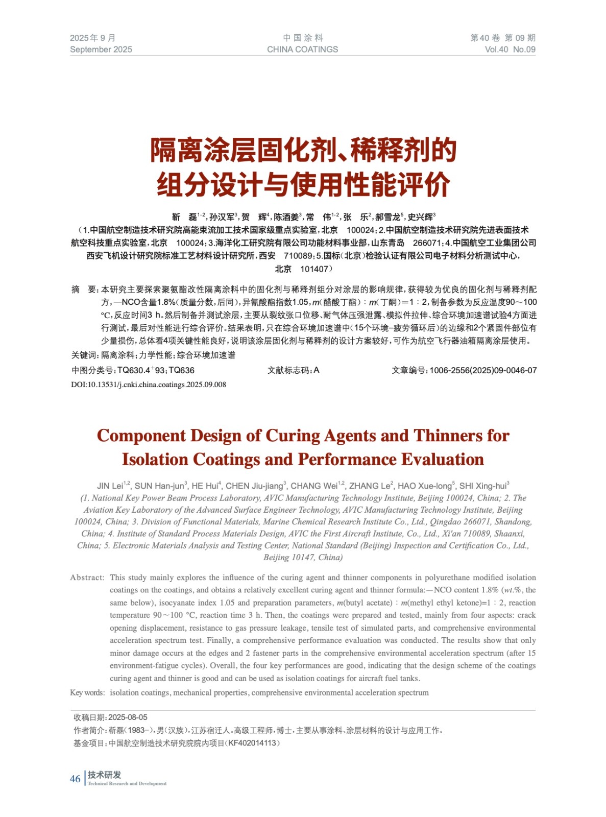 本文系作者@靳 磊,孫漢軍,賀 輝,陳酒姜,?!?,張 樂,郝雪龍,史興輝 授權中國涂料網發表,并經中國涂料網編輯,未經允許不得轉載,如需轉載請聯系chinacoatingnet@vip.163.com