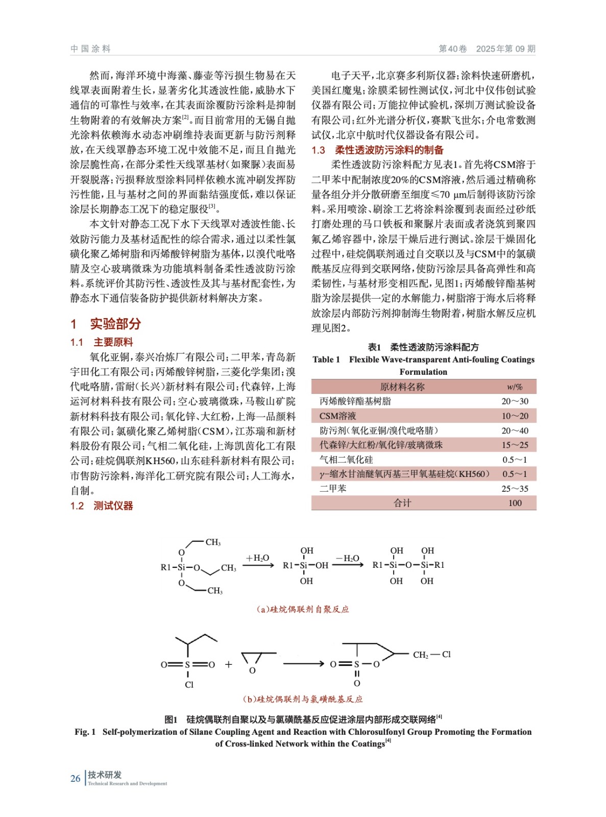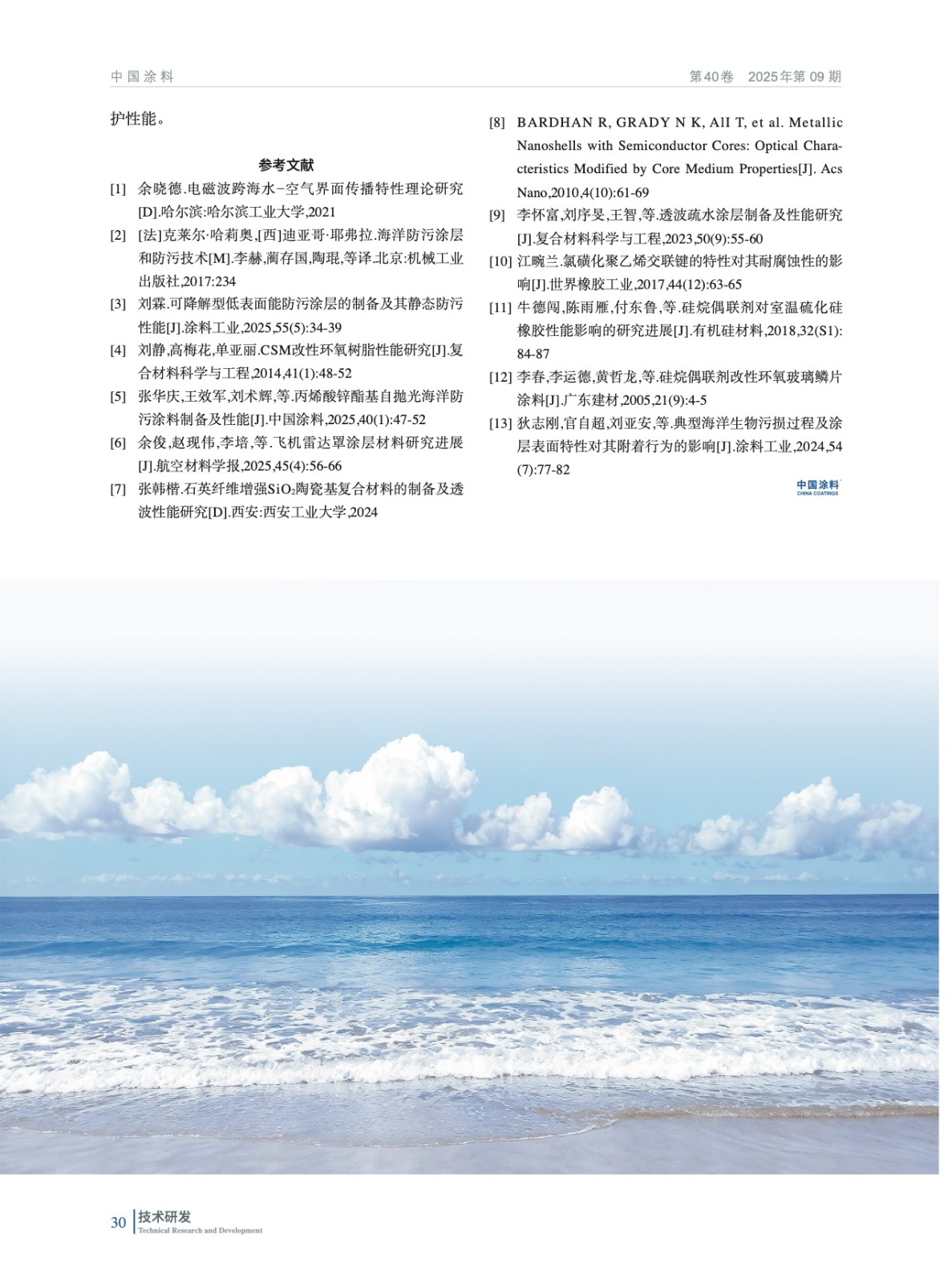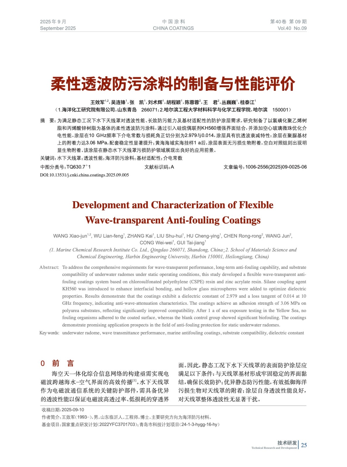 摘要:為滿足靜態(tài)工況下水下天線罩對透波性能、長效防污能力及基材適配性的防護(hù)涂層需求,研究制備了以氯磺化聚乙烯樹脂和丙烯酸鋅樹脂為基體的柔性透波防污涂料,通過引入硅烷偶聯(lián)劑KH560增強(qiáng)界面結(jié)合,并添加空心玻璃微珠優(yōu)化介電性能。涂層在10 GHz頻率下介電常數(shù)與損耗角正切分別為2.979與0.014,涂層具有抗透波衰減特性;涂層在聚脲基材上的附著力達(dá)3.06 MPa,配套穩(wěn)定性顯著提升;黃海海域?qū)嵑鞓? a后,涂層表面無污損生物附著,空白對照組則出現(xiàn)明顯生物附著。該涂層在靜態(tài)水下天線罩污損防護(hù)領(lǐng)域展現(xiàn)出良好的應(yīng)用前景。