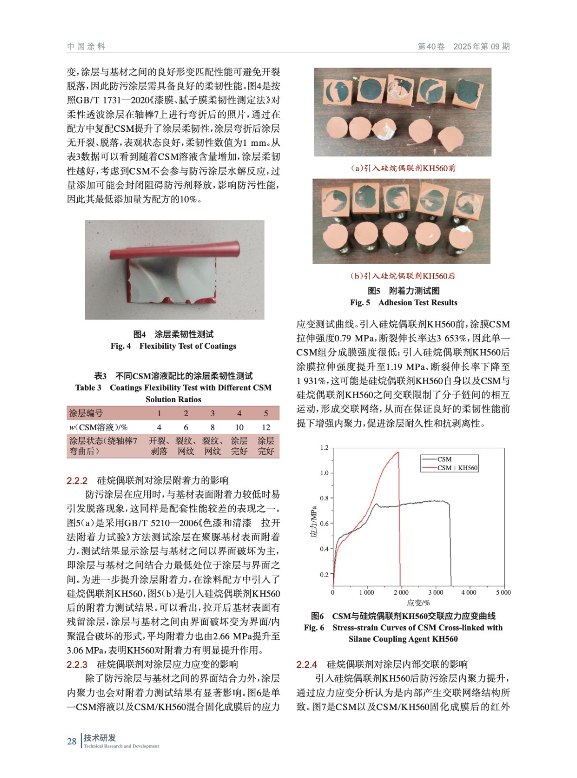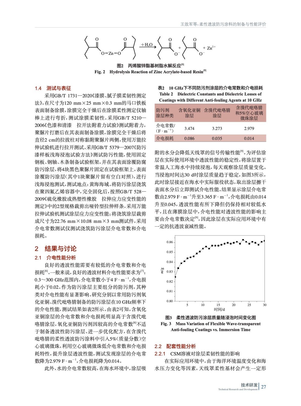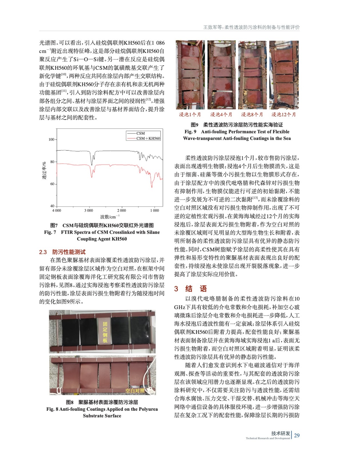 摘要:為滿足靜態(tài)工況下水下天線罩對透波性能、長效防污能力及基材適配性的防護(hù)涂層需求,研究制備了以氯磺化聚乙烯樹脂和丙烯酸鋅樹脂為基體的柔性透波防污涂料,通過引入硅烷偶聯(lián)劑KH560增強(qiáng)界面結(jié)合,并添加空心玻璃微珠優(yōu)化介電性能。涂層在10 GHz頻率下介電常數(shù)與損耗角正切分別為2.979與0.014,涂層具有抗透波衰減特性;涂層在聚脲基材上的附著力達(dá)3.06 MPa,配套穩(wěn)定性顯著提升;黃海海域?qū)嵑鞓? a后,涂層表面無污損生物附著,空白對照組則出現(xiàn)明顯生物附著。該涂層在靜態(tài)水下天線罩污損防護(hù)領(lǐng)域展現(xiàn)出良好的應(yīng)用前景。