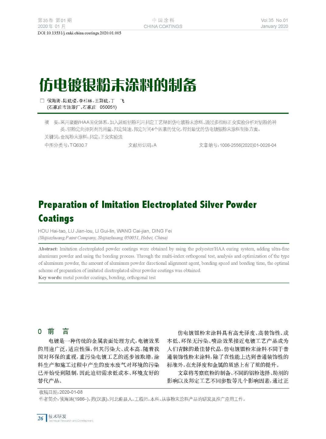 摘要:采用聚酯/HAA固化體系,加入超細(xì)鋁粉利用邦定工藝得到仿電鍍粉末涂料。通過(guò)多指標(biāo)正交實(shí)驗(yàn)分析對(duì)鋁粉的種類、鋁粉定向排列劑的用量、邦定轉(zhuǎn)速、邦定時(shí)間4個(gè)因素的優(yōu)化,得到最優(yōu)的仿電鍍銀粉末涂料制備方案。