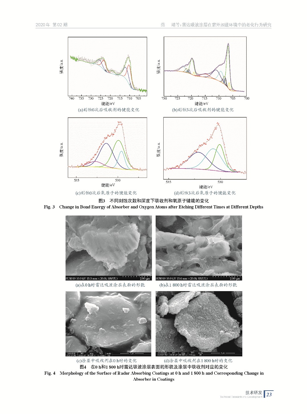 摘要:采用實驗室自制的雷達吸收涂層,探究雷達吸波涂層在紫外環境中的老化行為,開展了紫外光老化進行加速老化實驗。通過SEM和XPS分析表明,雷達吸波涂層吸收劑氧化產生了細小均勻的顆粒為Fe2O3,通過EIS分析表明,環氧樹脂老化過程中產生了羧基陰離子,經過了紫外光的加速老化實驗,雷達吸波涂層的表面粗糙度從0.84 μm上升到了1.17 μm。