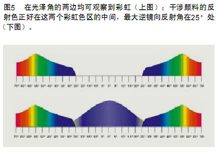 > 彩虹在逆鏡向反射角約35°~45°范圍內(nèi)開始出現(xiàn)彩虹色,根據(jù)種類的不同,干涉顏料顯示其反射色逆鏡向反射角約為 25°。兩種色彩范圍可通過兩種顏料混合獲得。