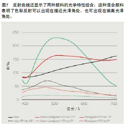 > 彩色顏料混合物在整個入射角和觀測角范圍內(nèi)會影響色彩效果。彩色顏料的色調(diào)會變,彩虹色受到影響,總體上可能不再能被識別出來。