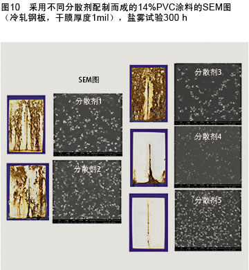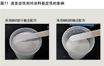 例如,在研磨料中加入五種不同的分散劑進(jìn)行試驗(yàn)評估,發(fā)現(xiàn)涂料的防腐性出現(xiàn)截然不同的結(jié)果(圖9)。為了深入了解這一結(jié)果的原因,采用SEM分析對涂料進(jìn)行評估(圖10),結(jié)果令人震驚。當(dāng)分散劑的疏水性越強(qiáng)時,二氧化鈦在醇酸樹脂涂料中的分散越好,從而防腐性能更好。因此必須選擇恰當(dāng)?shù)闹鷦@對其他助劑,包括流變改性劑(RM)和消泡劑,也是一樣的。圖11顯示了RM1是如何導(dǎo)致了一個不穩(wěn)定的涂料配方,而RM2能使涂料增稠,達(dá)到一定的黏度,而不會出現(xiàn)絮凝結(jié)塊。