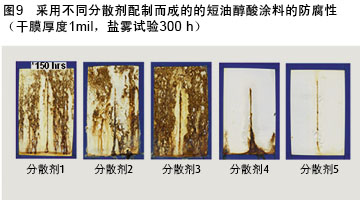 前面提到,制備低VOC醇酸涂料的技術(shù)往往會犧牲涂料的性能,例如會降低涂料的光澤、附著力及防腐性。表6給出了市售水性醇酸涂料與增強(qiáng)型水性醇酸樹脂分散體涂料的性能對比。很明顯,所有市售水性醇酸涂料的光澤較、附著力均要比增強(qiáng)型水性醇酸分散體制備的涂料要低和差。硬度和抗沖擊性的數(shù)據(jù)相當(dāng),而采用中油醇酸樹脂分散體制成的涂料抗沖擊性尤為優(yōu)異。不出所料,與親水改性樹脂制備的的涂料相比,由未改性的疏水型醇酸樹脂制備的涂料的防腐性較好。圖12對增強(qiáng)型水性醇酸樹脂分散體制備的涂料與市售水性醇酸涂料經(jīng)300 h鹽霧試驗(yàn)后的耐腐蝕性進(jìn)行了對比。短油醇酸分散體制備的涂料的性能明顯優(yōu)于其它所有的市售水性醇酸乳膠涂料,與 VOC>300 g/L的水稀釋性醇酸涂料的性能相當(dāng),但提高了防腐性能。
