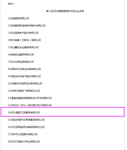 近日,由河北省工業(yè)和信息化廳組織開展的省管理創(chuàng)新示范企業(yè)創(chuàng)建活動經(jīng)專家評審并公示,包括河北晨陽工貿(mào)集團(tuán)有限公司在內(nèi)的18家企業(yè)被認(rèn)定為第二批“河北省管理創(chuàng)新示范企業(yè)”。