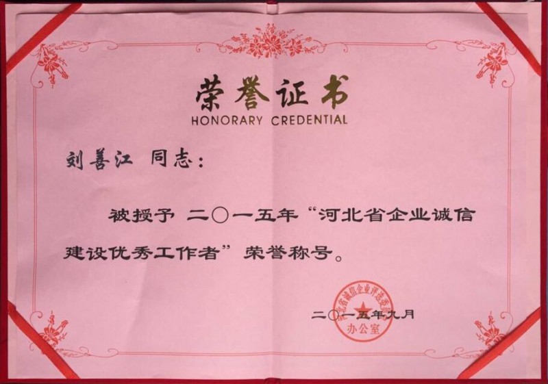 在河北省企業家協會等部門聯合開展的“河北省誠信企業”評選活動中,河北晨陽工貿集團有限公司被評為2015年“河北省誠信企業”,董事長劉善江榮獲“河北省企業誠信建設優秀工作者”稱號。