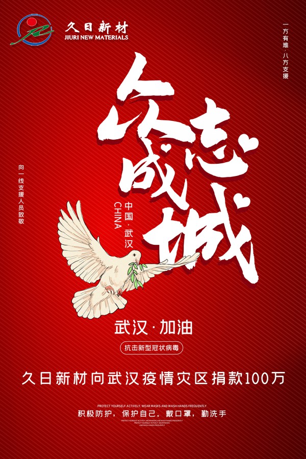 面對緊迫疫情,天津久日新材料股份有限公司(以下簡稱“久日新材”)積極響應中央決策部署和天津市委要求,做好自身企業和員工防護的同時,積極投身疫情防控工作,迅速部署,并向疫區伸出了援助之手,以實際行動展現了一個上市公司的社會責任。2020年1月31日,久日新材通過天津市慈善協會向武漢疫情災區捐款100萬元,用于武漢市新型冠狀病毒肺炎疫情的防控與救治。