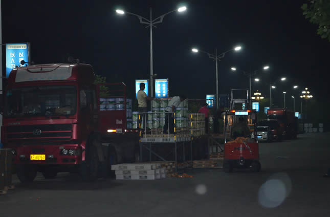 圖:夜間,在晨陽水漆廠區內排起的裝貨卡車