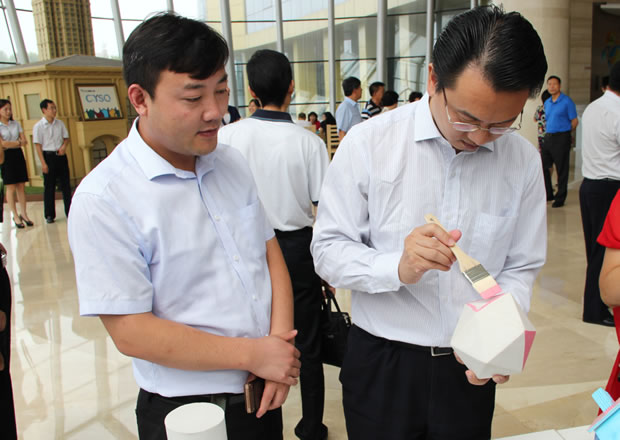 19日,中科院專家一行在保定市科技與知識產權局的帶領下重點對晨陽水漆進行了參觀考察,先后觀摩了晨陽水漆宣傳片、工程施工樣板、企業生產車間,并在現場試刷體驗。專家們對晨陽水漆的環保特性表現出了極大的興趣,對粉刷完的小玩具愛不釋手,紛紛表示今后愿意以身作則,充當水漆的推廣員。