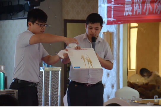 當天,還舉行了晨陽水漆產品推廣會。晨陽水漆培訓部員工介紹了公司的歷史背景、水漆未來的發展趨勢、國家相關扶持政策和2015年品牌發展方向。現場,通過產品試刷和養金魚試驗,油工師傅們對晨陽水漆產品環保特性和施工效果表示肯定。
