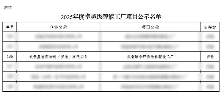 近日,工信部正式公示了2025年度卓越級智能工廠項目名單。經過多輪嚴格評審,北新嘉寶莉涂料(安徽)有限公司打造的“數智融合環(huán)保涂料智能工廠”成功入選,榮獲國家級智能制造領域的重要認可,國家級名片再+1!