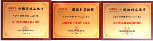 2015年12月18日,由中國涂料工業協會主辦的“2015中國水性工業涂料發展研討會暨2015中國涂料品牌榜頒獎盛典”在北京隆重舉辦,威士伯榮獲“2015年建筑涂料名牌獎”,華潤漆榮獲“2015年建筑涂料名牌獎”和“2015中國木器涂料名牌獎”。