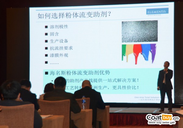 推介會(huì)上,海名斯技術(shù)二部經(jīng)理林東升先生介紹了公司相關(guān)溶劑型產(chǎn)品,包括4080F、粉體流變助劑、超分散劑。技術(shù)主任張麗英女士重點(diǎn)分享了水性防腐&水性金屬烤漆案例、水性玻璃漆&水性木器案例。作為一個(gè)專業(yè)的助劑及樹(shù)脂生產(chǎn)商,海名斯以其優(yōu)異的產(chǎn)品性能與環(huán)保技術(shù),致力于推動(dòng)中國(guó)涂料行業(yè)的環(huán)保進(jìn)步,在中國(guó)市場(chǎng)推出了系列化的水性體系用助劑產(chǎn)品。