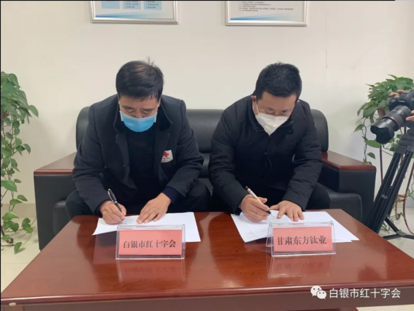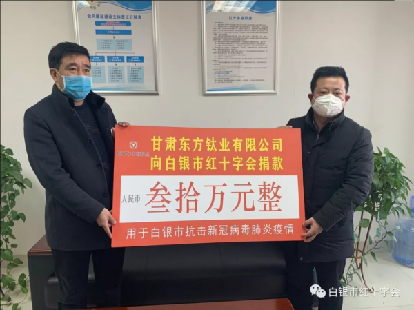 1月31日上午,大年初七,甘肅東方鈦業有限公司向白銀市紅十字會捐贈人民幣30萬元,用于白銀市新型冠狀病毒肺炎疫情防控。
