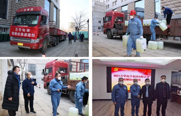 1月30-31日,萬華陸續向煙臺海關、開發區交警隊、蓬萊應急管理局、潮水區應急管理局以及部分小區和醫療機構免費捐贈了消毒液。截至1月31日,已向社會各界捐贈了約17700公斤消毒液。
