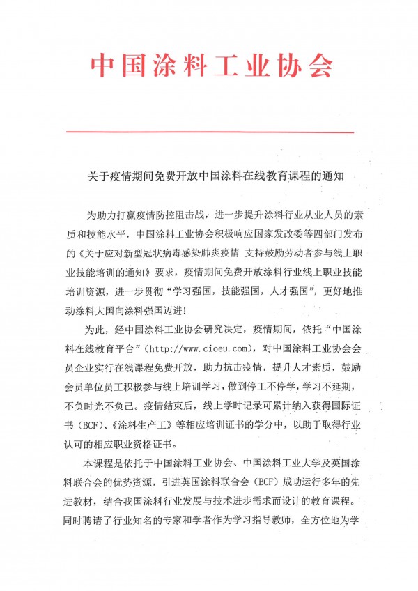 為此,經(jīng)中國(guó)涂料工業(yè)協(xié)會(huì)研究決定,疫情期間,依托“中國(guó)涂料在線教育平臺(tái)”(http://www.cioeu.com),對(duì)中國(guó)涂料工業(yè)協(xié)會(huì)會(huì)員企業(yè)實(shí)行在線課程免費(fèi)開(kāi)放,助力抗擊疫情,提升人才素質(zhì),鼓勵(lì)會(huì)員單位員工積極參與線上培訓(xùn)學(xué)習(xí),做到停工不停學(xué),學(xué)習(xí)不延期,不負(fù)時(shí)光不負(fù)己。疫情結(jié)束后,線上學(xué)時(shí)記錄可累計(jì)納入獲得國(guó)際證書(shū)(BCF)、《涂料生產(chǎn)工》等相應(yīng)培訓(xùn)證書(shū)的學(xué)分中,以助于取得行業(yè)認(rèn)可的相應(yīng)職業(yè)資格證書(shū)。