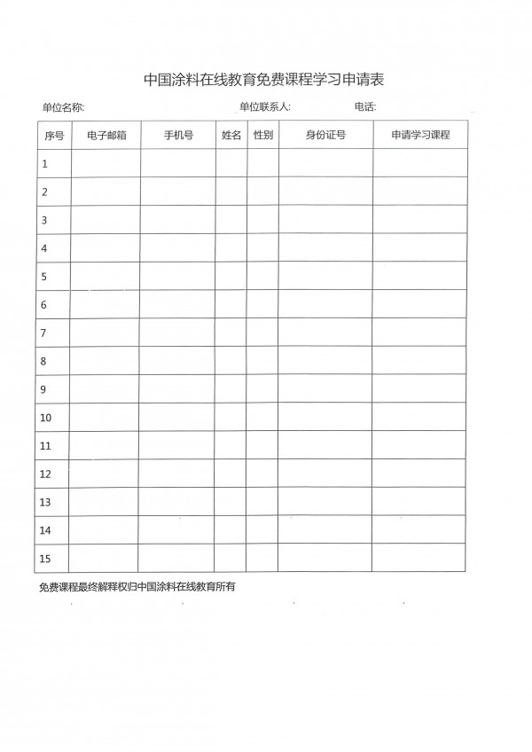 中國(guó)涂料在線教育免費(fèi)課程學(xué)習(xí)申請(qǐng)表