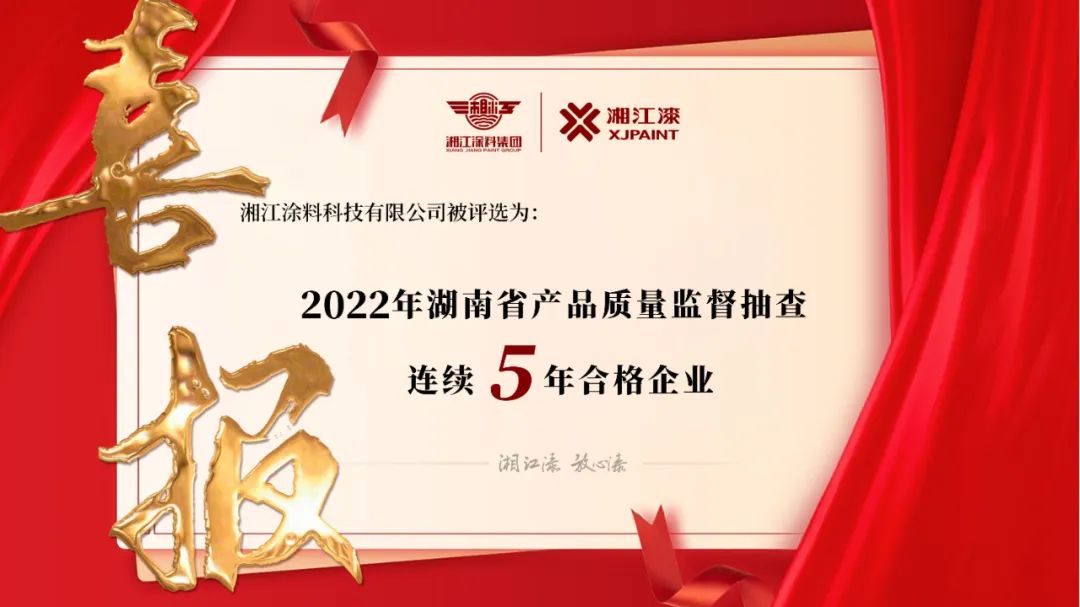 2022年6月,湘江涂料科技有限公司被評選為“2022 年湖南省產品質量監督抽查連續5年合格企業(2017 年-2021 年)”