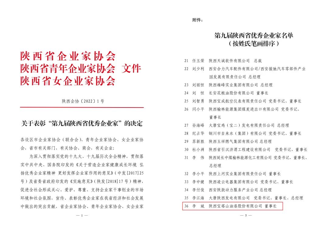 近日,由陜西省企業家協會于2021年-2022年在全省范圍內聯合開展的評選“第九屆陜西省優秀企業家”活動落下帷幕,經過現場考評、網絡公示等嚴格考核,在陜西省范圍內共評選出84名優秀企業家,陜西寶塔山油漆股份有限公司董事長李斌獲評“第九屆陜西省優秀企業家”稱號。