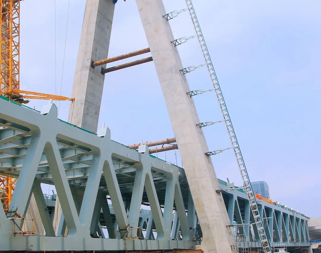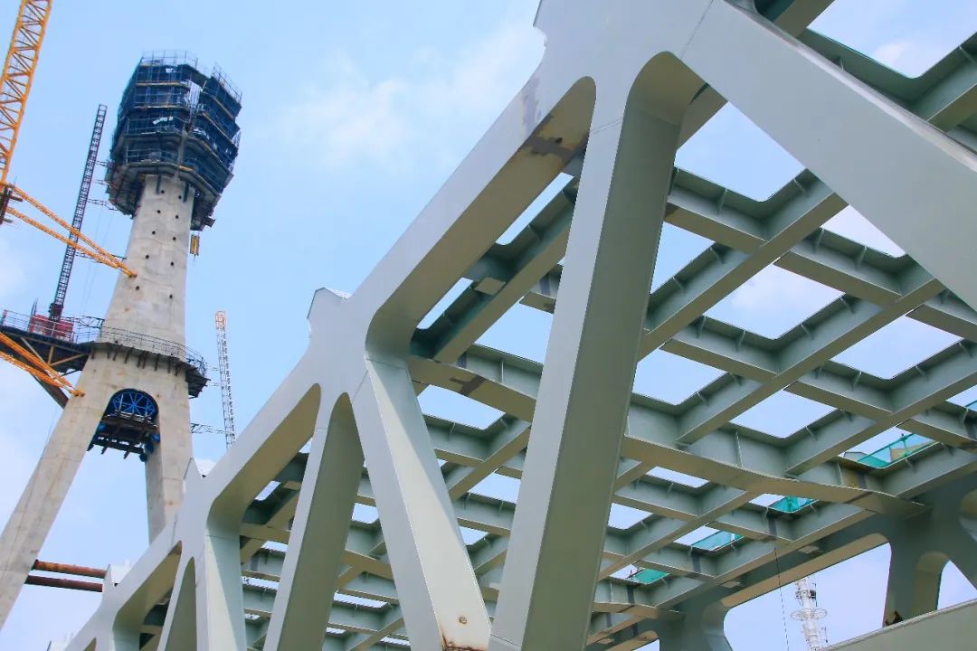橋梁塔身設計為鉆石型,主塔高87米(共21節),斜拉索采用空間扇形索面。風荷橋為鋼桁架結構,重約7000噸,主梁采用等高度三角桁,全橋分140段鋼構件運輸、吊裝。