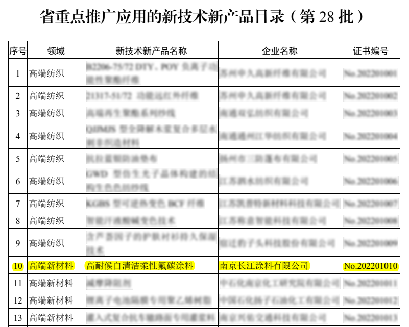 日前,江蘇省新技術(shù)新產(chǎn)品推廣應(yīng)用工作聯(lián)席會議辦公室頒布了第28批“省重點推廣應(yīng)用的新技術(shù)新產(chǎn)品目錄”,憑借自主創(chuàng)新水平和在重防腐領(lǐng)域的突出表現(xiàn),長江“高耐候自清潔柔性氟碳涂料”再次上榜新產(chǎn)品名錄!