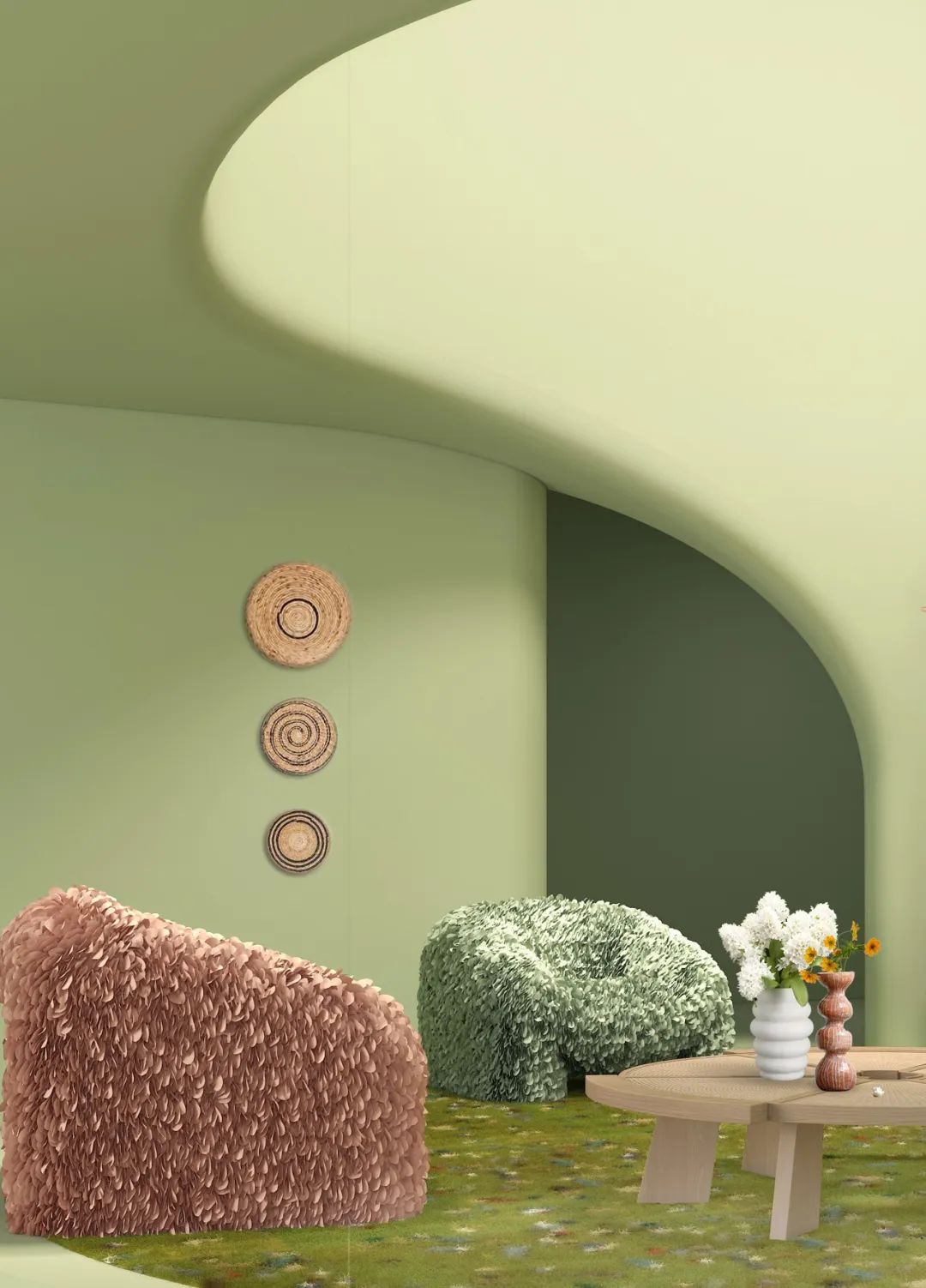 大面積的春辰綠,為室內奠定了新鮮、健康的自然基調。以輕柔的綠色為核心,搭配雅致的淺棕黃色、暖橙色,形成和諧舒暢的室內色彩氛圍;豐富質樸的藤編、毛絨肌理等點綴其間,為室內注入自然的文藝氣息,共同打造舒適怡人的文藝度假風格。