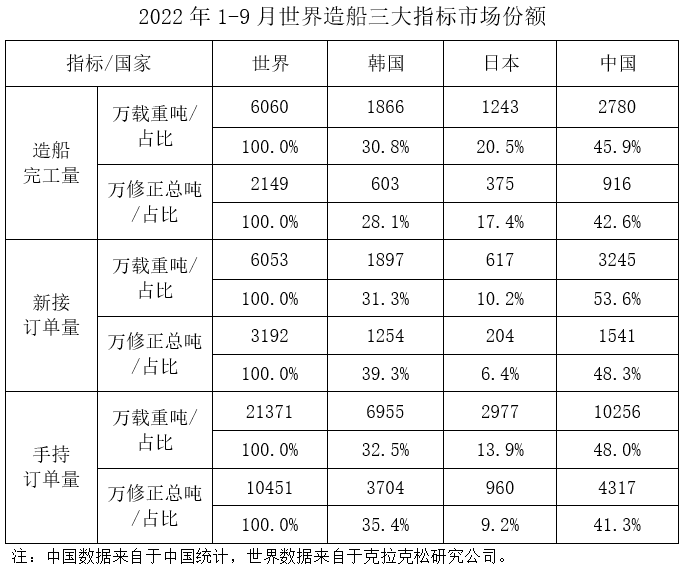1~9月,我國造船完工量、新接訂單量、手持訂單量分別占世界市場份額的45.9%、53.6%和48%。