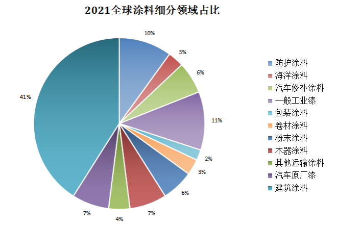 劉杰指出,從2021年中國與全球涂料行業細分對比來看,中國涂料行業細分領域占比與全球涂料細分領域占比并無太大差異,建筑涂料占比最大,其次是防護涂料。