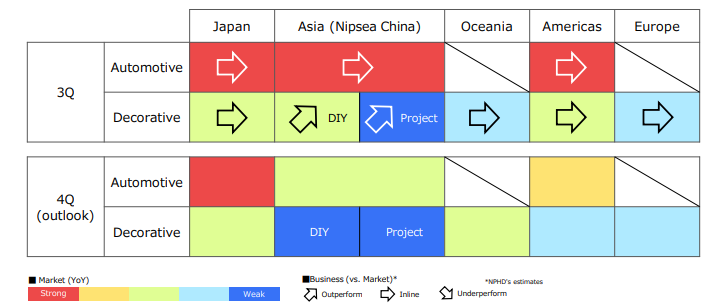 前三季度由于半導體芯片短缺和其他因素導致汽車生產數量下降,導致日本本土的汽車涂料銷售收入下降。受新建住宅開工穩定和其他有利市場條件的推動,工業涂料收入增加。由于市場條件的改善,裝飾涂料收入也有所增加。