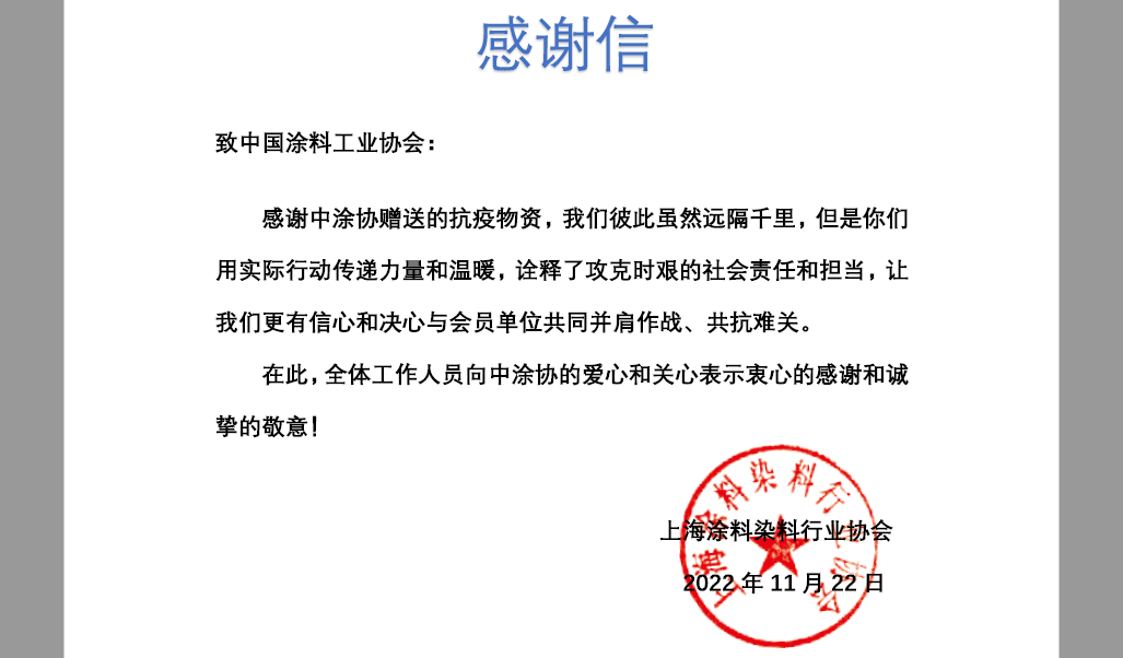 秉承“為企業發展服務,為行業振興服務”的宗旨、竭誠為會員單位服務的理念,中國涂料工業協會時刻關注、關心涂料行業的一舉一動,面對本次洶涌而來的疫情,協會以實際行動助力防控,發揮社會團體的使命擔當,展現作為涂料人“攜手同行、風雨同舟”的大愛精神,為堅守在抗疫一線的涂料人送去關愛和溫暖,為他們繼續堅守崗位、逆行而上注入了溫暖、堅定的力量。相信在大家的共同努力下,一定能夠凝聚起眾志成城、全力以赴、共克時艱的強大力量,打贏本次疫情防控阻擊戰。