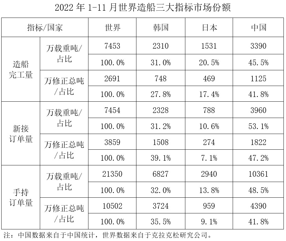 按修正總噸計,中國造船完工量、新接訂單量、手持訂單量分別占世界市場份額的41.8%、47.2%和41.8%。