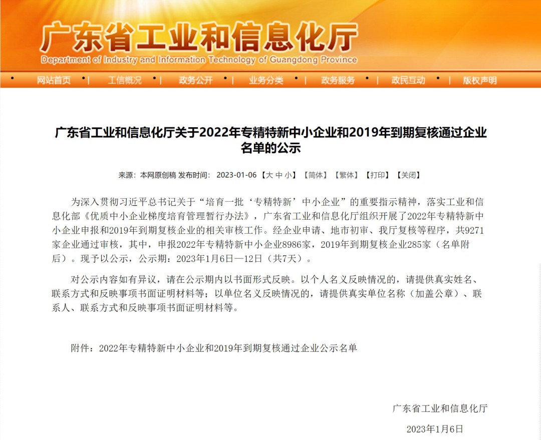 廣東省2022年“專精特新”企業名單公示