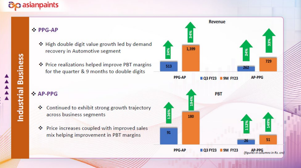 亞洲涂料的工業涂料業務,主要由亞洲涂料與PPG合資的兩家公司,PPG-AP和AP-PPG來經營。自2022下半年印度汽車工業出現復蘇,PPG-AG工業涂料業務受到提振,在2023財年的九個月時間內,PPG-AP板塊的增長率已經超過34%,PPG-AG前九個月利潤約為9.1億盧比,利潤增幅194%。另一方面,AP-PPG 本季度銷售額增幅為24%,前九個月利潤約為5.1億盧比。