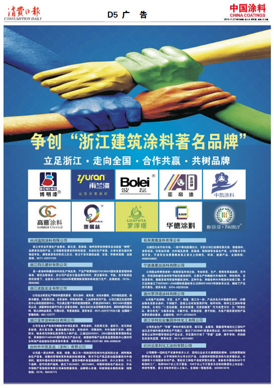 《中國涂料報》(電子版)的一切內容(包括但不限于文字、圖片、PDF、圖表、標志、標識、商標、版面設計、專欄目錄與名稱、內容分類標準以及為讀者提供的任何信息)僅供中國涂料信息網讀者閱讀、學習研究使用,未經中國涂料雜志社有限公司及/或相關權利人書面授權,任何單位及個人不得將《中國涂料報》(電子版)所登載、發(fā)布的內容用于商業(yè)性目的,包括但不限于轉載、復制、發(fā)行、制作光盤、數據庫、觸摸展示等行為方式,或將之在非本站所屬的服務器上作鏡像。否則,中國涂料雜志社有限公司將采取包括但不限于網上公示、向有關部門舉報、訴訟等一切合法手段,追究侵權者的法律責任。