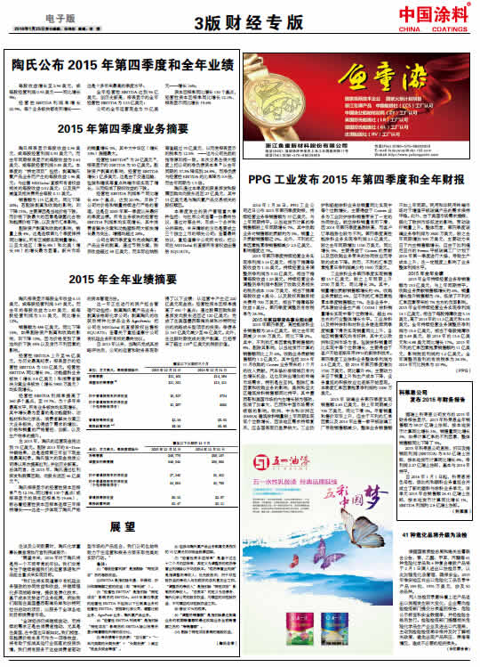 PPG工業發布2015年第四季度和全年財報
