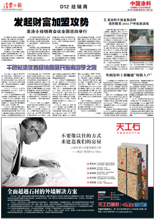 《中國涂料報》(電子版)的一切內容(包括但不限于文字、圖片、PDF、圖表、標志、標識、商標、版面設計、專欄目錄與名稱、內容分類標準以及為讀者提供的任何信息)僅供中國涂料信息網讀者閱讀、學習研究使用,未經中國涂料雜志社有限公司及/或相關權利人書面授權,任何單位及個人不得將《中國涂料報》(電子版)所登載、發布的內容用于商業性目的,包括但不限于轉載、復制、發行、制作光盤、數據庫、觸摸展示等行為方式,或將之在非本站所屬的服務器上作鏡像。否則,中國涂料雜志社有限公司將采取包括但不限于網上公示、向有關部門舉報、訴訟等一切合法手段,追究侵權者的法律責任。