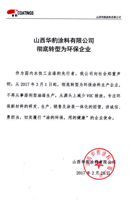 2017 年2 月28 日山西華豹涂料 有限公司發表聲明稱,從2017 年3 月 1 日起徹底轉型為環境友好型涂料生 產企業,不再從事溶劑型涂料生產, 從源頭上減少VOC 排放。